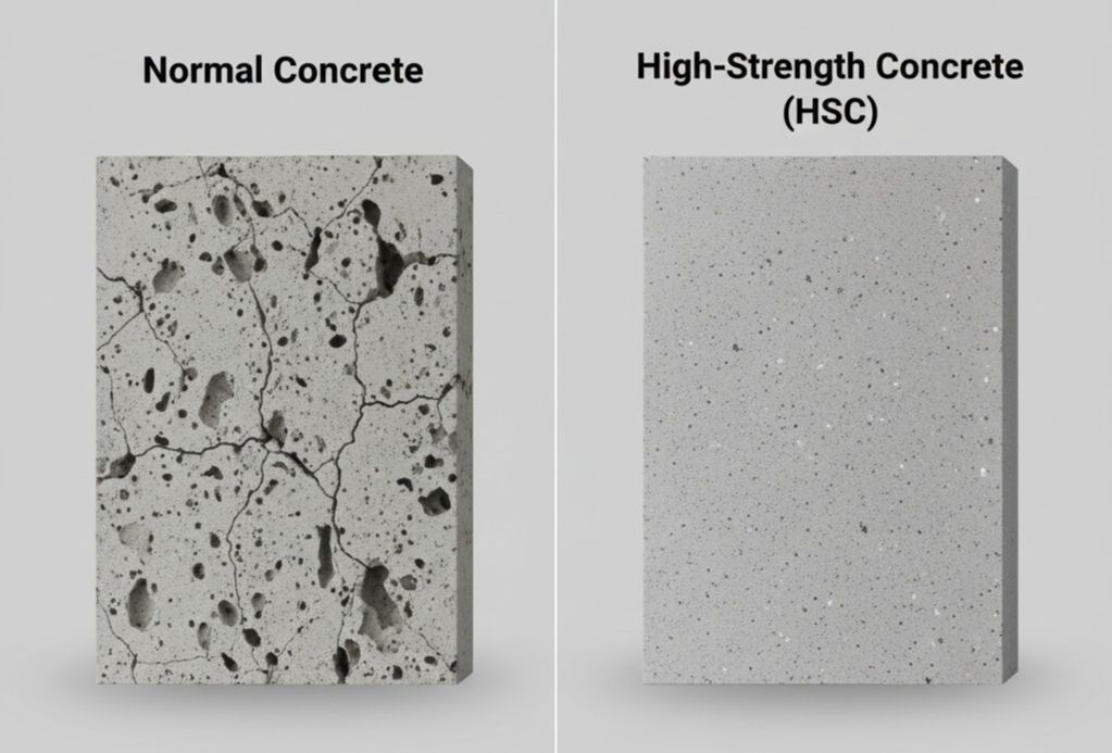 مقارنة بصيطة هنا بين الخرسانة العادية NSC والخرسانة عالية المقاومة HSC